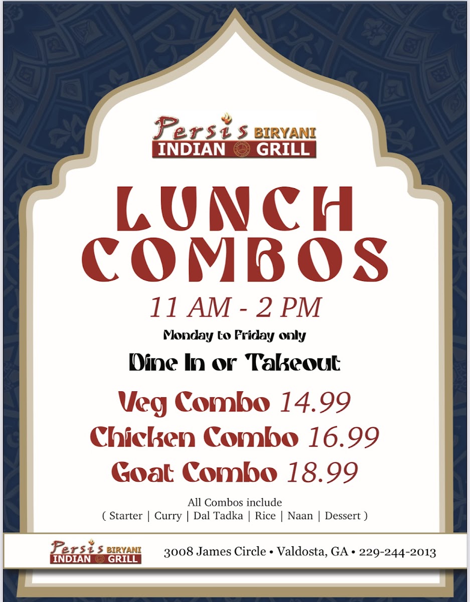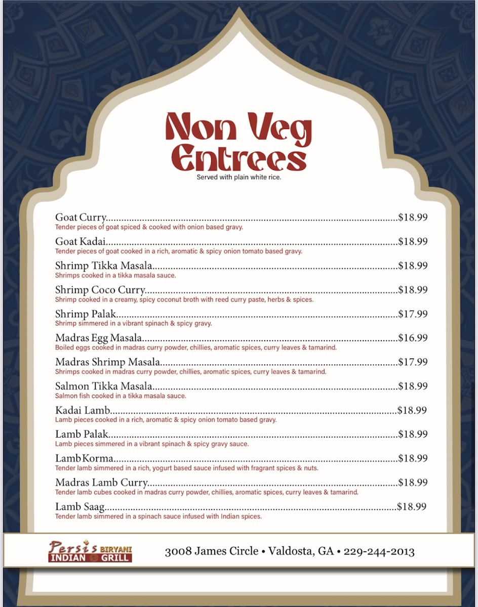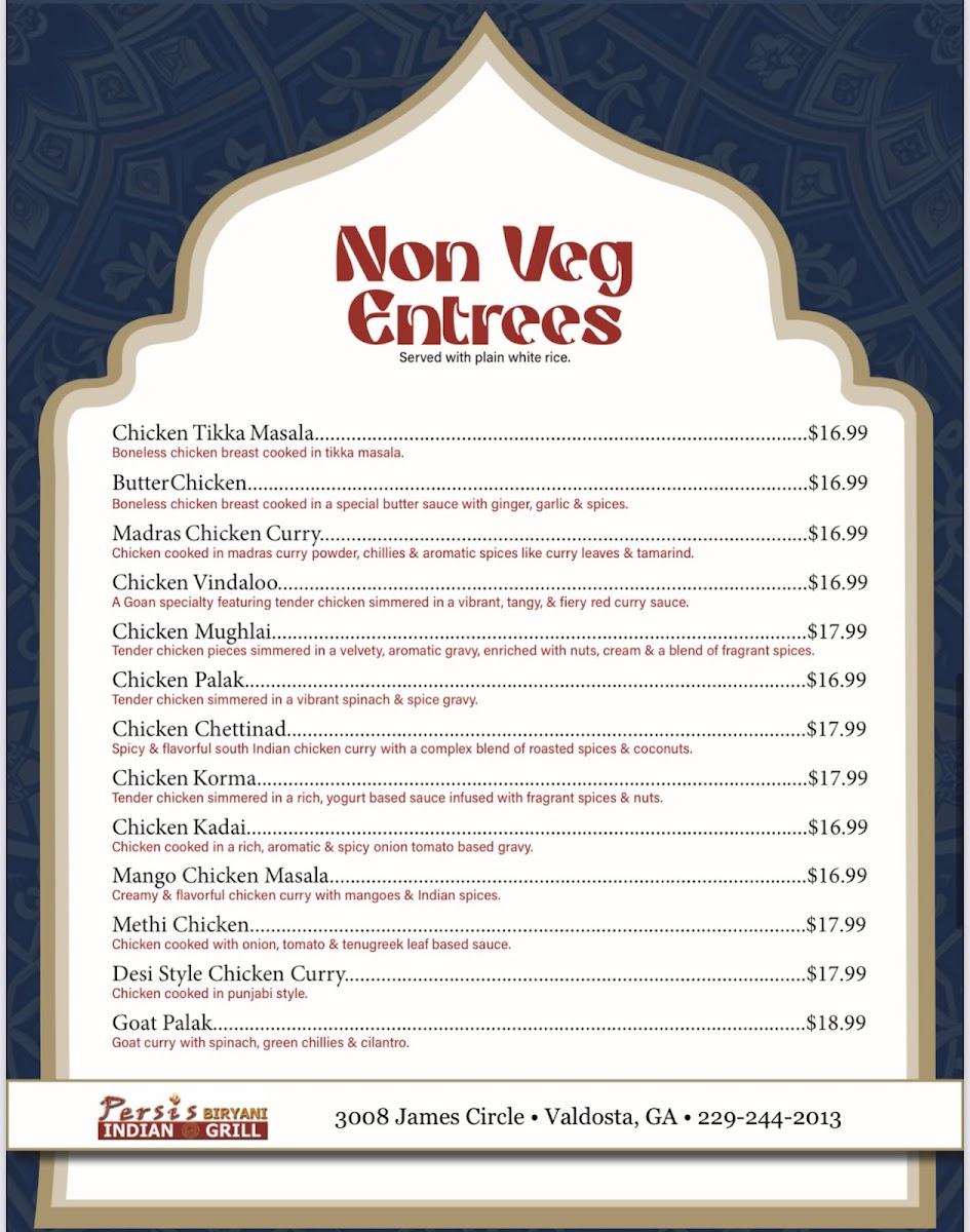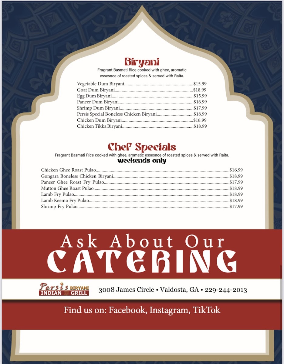 Persis Biryani Indian Grill, located at 3008 James Cir, Valdosta, GA, is a delightful addition to the local dining scene, especially for Indian cuisine lovers. Renowned for its exceptional biryanis, including chicken, goat, and shrimp variations, the restaurant delivers bold flavors and tenderness that impress. Diners rave about dishes like Butter Chicken and Tandoori Chicken, showcasing the chef's talent. The garlic and cheese naan, paired with mango lassi, enhances the experience, although some menu offerings may vary in execution. With attentive service and a welcoming atmosphere, Persis Biryani is swiftly becoming a favorite for those seeking authentic Indian flavors in Valdosta.